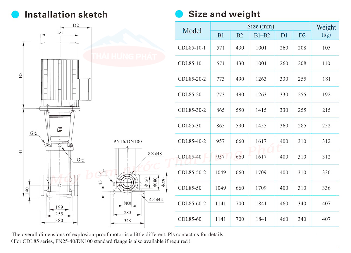Bảng thông số kích thước chi tiết của Máy bơm bù áp CNP CDL/CDLF 85-40 40HP